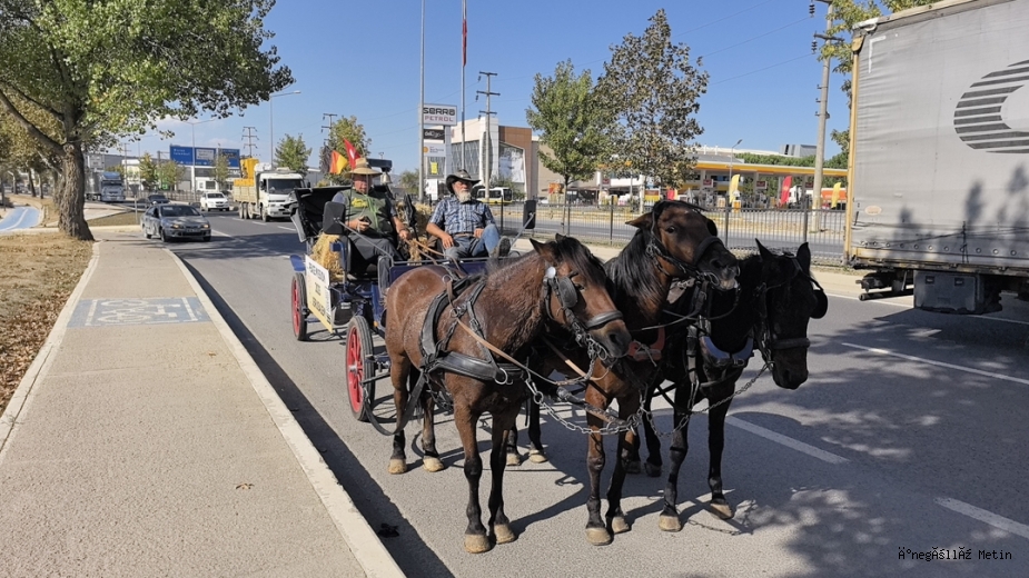 151 gündür yolda olan çiftçiler, üç atın çektiği arabalarıyla Bursa’nın İnegöl ilçesinden geçti. Yol boyunca çeşitli şehirlerde insanlarla buluşan ikili, barış ve dostluk mesajı veriyor.