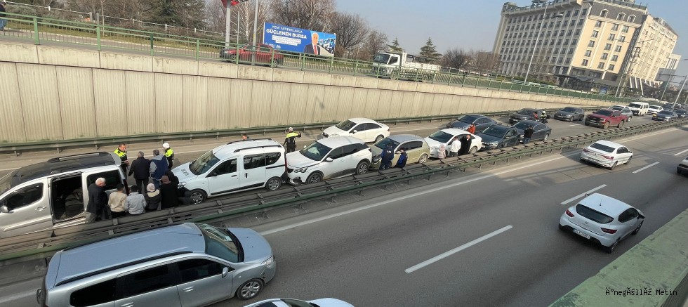 Kaza, merkez Osmangazi ilçesi Merinos alt geçidinde meydana geldi. Edinilen bilgiye göre, öndeki aracın durduğunu fark etmeyen sürücüler, bir anda peş peşe çarpıştı. 7 aracın karıştığı kazada, herhangi bir yaralı ve can kaybı yaşanmazken, maddi hasar meydana geldi. Polis ekiplerinin müdahalesiyle yol tekrar trafiğe açıldı.