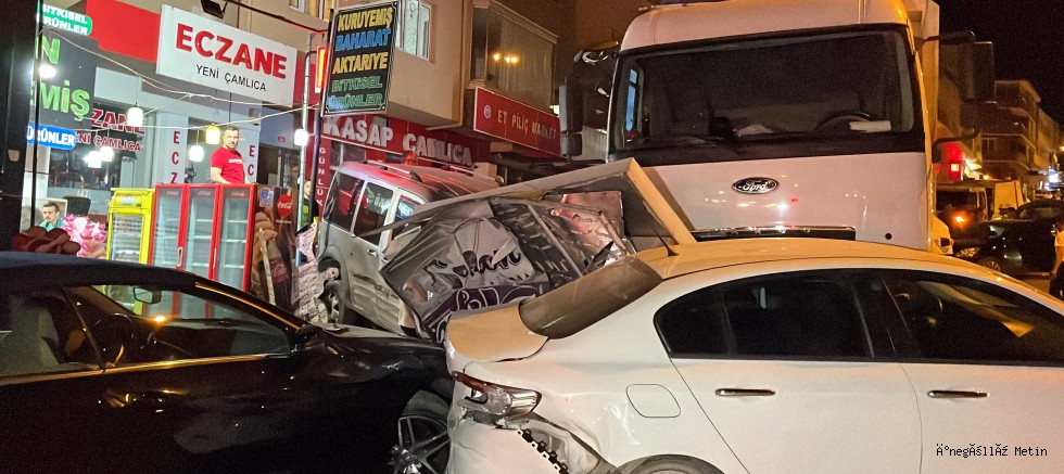 Un indirildiği sırada freni boşalan kamyon, önce yoldaki uyarı levhasına çarptı. Daha sonra yokuş aşağı park halindeki otomobillere çarparak ilerleyen kamyon, kaldırıma çıkarak durdu.
