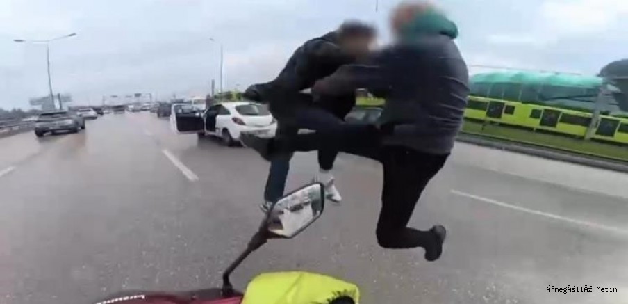 Bursa-İzmir yolu üzerinde ‘yol verme' meselesi nedeniyle iki sürücü arasında tartışma çıktı. Araçlarından inen taraflar birbirlerine uçan tekmeyle saldırdı. Korku dolu anlar kameraya yansırken, tarafları yoldan geçen kurye ve çevredeki sürücüler ayırdı. Görüntüler üzerine harekete geçen Bursa İl Emniyet Müdürlüğü ekipleri, kavga eden sürücülerin Serkan K. ile Emirhan A. olduğunu tespit etti. İki sürücü gözaltına alındı. Polis ekiplerince sürücülere toplamda 13 bin lira idari ceza uygulandı.