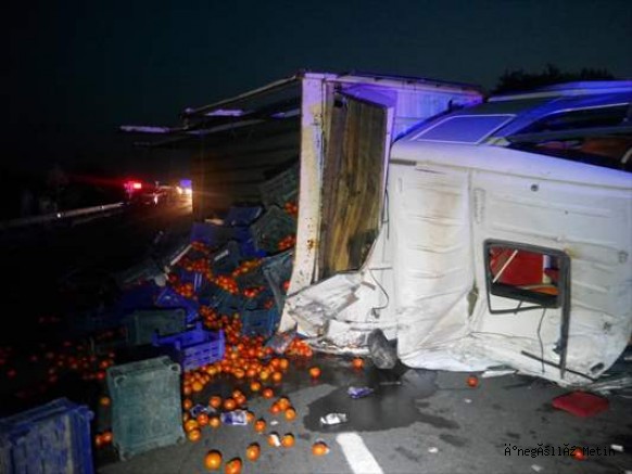 Kazanın etkisiyle savrulan kamyon daha sona aynı yönde ilerleyen 35 EKS 068 plakalı yolcu otobüsüne ve 06 CKE 758 plakalı otomobile de çarptıktan sonra devrildi. Kamyonun kasasındaki domatesler yola savruldu.