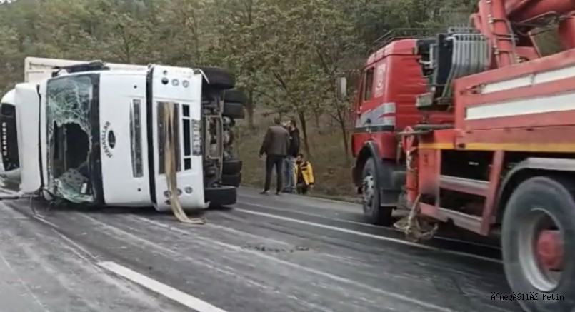 Trafik tek şerit halinde devam ederken, yapılan çalışmanın ardından kazaya karışan kamyonun yoldan çekilmesi ile trafik normale döndü.