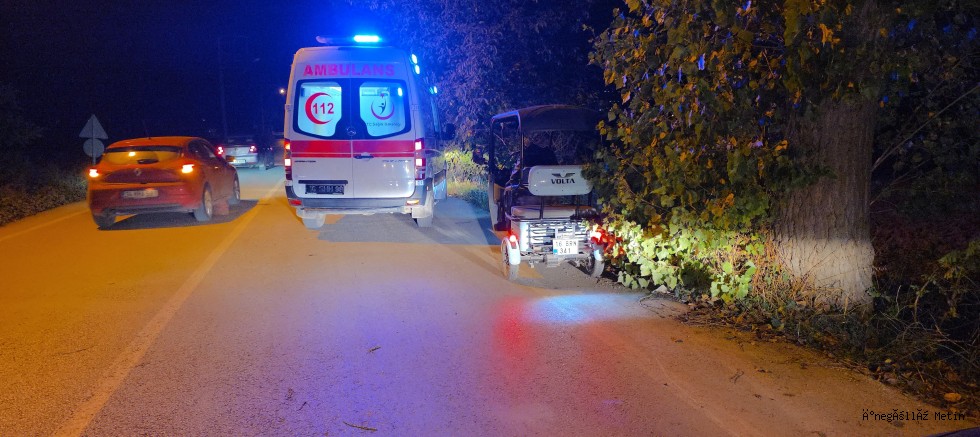 Edinilen bilgilere göre, Selma T. (51) idaresindeki 16 BRN 341 plakalı elektrikli triportör, sürücüsünün direksiyon hâkimiyetini kaybetmesi sonucu yoldan çıkarak devrildi. Kazada sürücü Selma T. (51) ile araçta yolcu olarak bulunan Nebahat İ. (63) yaralandı.