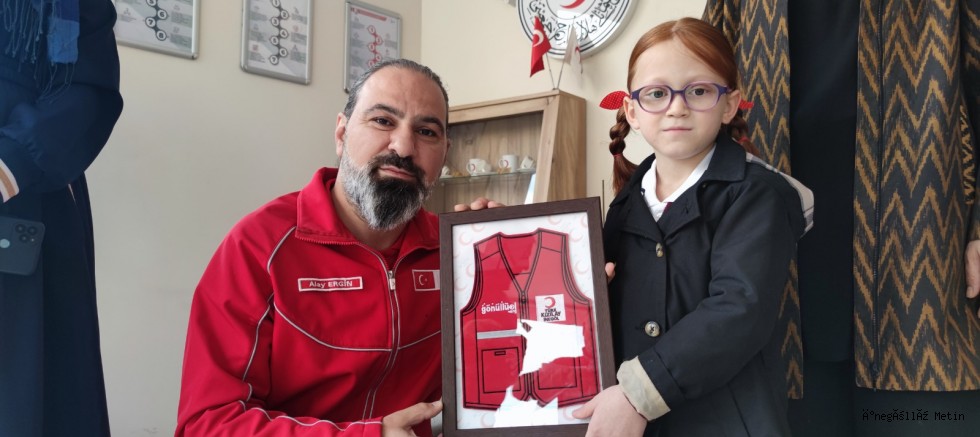 İsrail’in Filistin’deki katliamlarını izledikten sonra bir dergi hazırlayarak çeşitli desteklerle dergisini bastıran ve Filistin yararına satışa sunan 7 yaşındaki Aslıhan Karakurt, el ettiği 40 bin liralık geliri Gazze yararına İnegöl Kızılay Şube Başkanı Alay Ergin’e teslim etti.