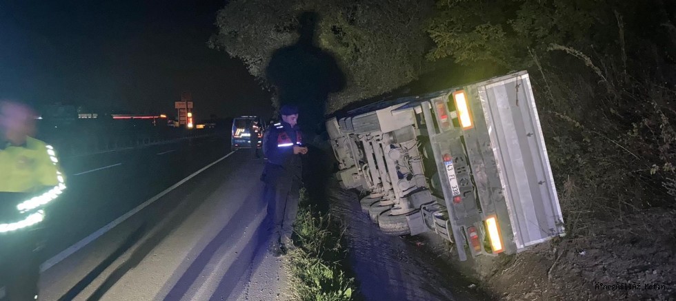 Bayram G. İdaresindeki 43 AEA 670 plakalı tır, seyir halindeyken sürücüsünün direksiyon hakimiyetini kaybetmesinin ardından kontrolden çıkarak devrildi.