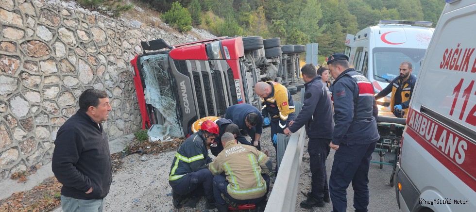 Edinilen bilgilere göre, İnegöl istikametinden gelen Ahmet S. idaresindeki kamyon, Mezit Mahallesi yakınlarında sürücüsünün direksiyon hâkimiyetini kaybetmesi sonucu kontrolden çıkarak devrildi.