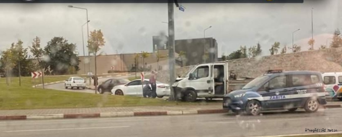 Hikmet Şahin Köprülü kavşağında yağışla meydana gelen kazada kontrolden çıkan kamyonet, trafik yönlendirme direğine çarptı; 2 kişi yaralandı.