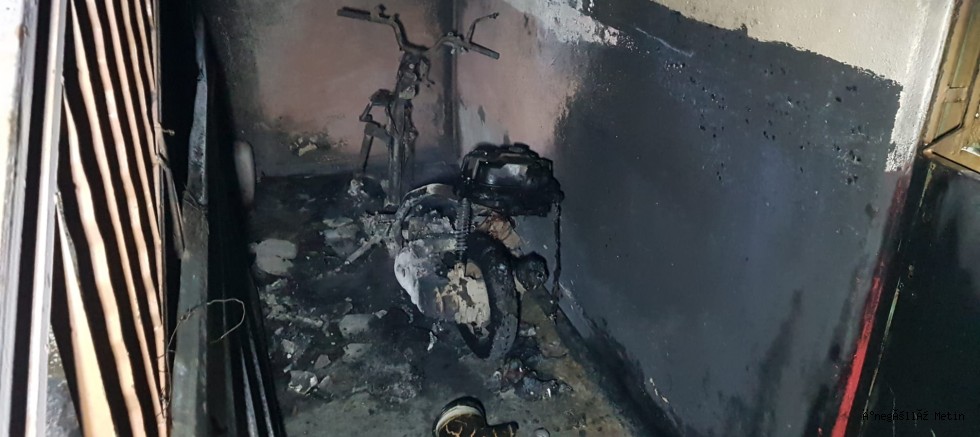 Binanın merdiven boşluğuna park edilen 16 ALP 323 plakalı motosiklet, iddiaya göre bazı kişi ya da kişiler tarafından ateşe verildi.