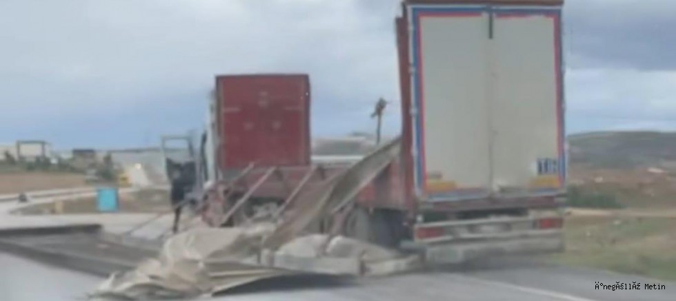 Sabah saatlerindeki şiddetli rüzgar nedeniyle Hamzabey Organize Sanayi Bölgesi kavşağında bir tırın yan demirleri uçtu.