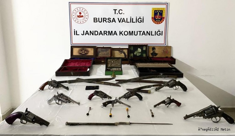 Burada yapılan aramalarda 9 ruhsatsız tabanca, tarihi eser niteliğinde olduğu değerlendirilen 2 kılıç, kama, şiş ve 4 mühür ele geçirildi.