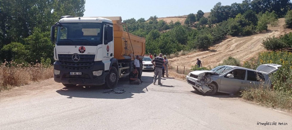 Edinilen bilgilere göre, Elnur B. (38) idaresindeki 43 AAZ 575 plakalı otomobil ile karşı yönden gelen Burhan Ç. (54) yönetimindeki 16 ABL 426 plakalı hafriyat kamyonu kafa kafaya çarpıştı. Çarpışmanın etkisiyle otomobil sürücüsü Elnur B. ile yanında yolcu olarak bulunan babası Mehmet B. (63) yaralandı.