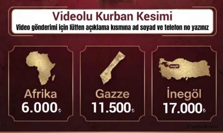 Açıklamaya göre 2026 yılı kurban hisse bedelleri Afrika için 6 bin TL, Gazze için 11 bin 500 TL ve İnegöl için 17 bin TL olarak belirlendi.