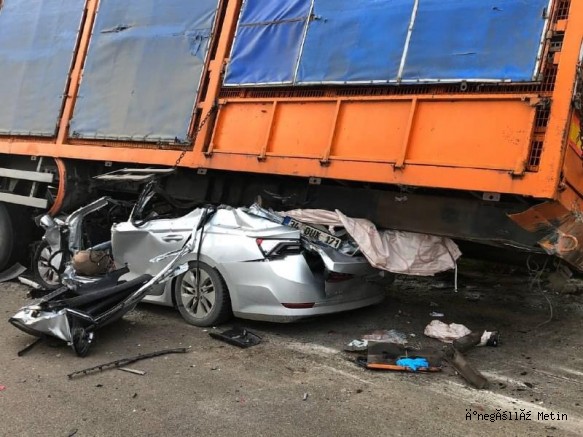 Sürücünün park etmesinden yaklaşık 20 dakika sonra aynı yöne giden M.V.Y’nin (39) kullandığı 34 DUK 171 plakalı otomobil, tıra arkasından çarptı. Tamamı tırın altına giren otomobilin üst bölümü ezildi.