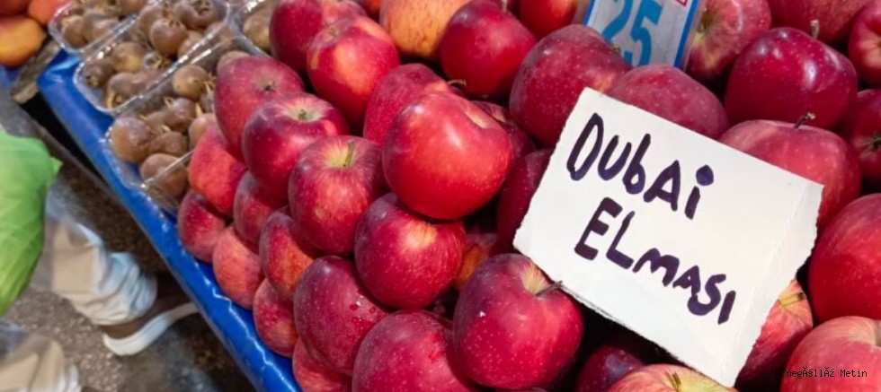 Gerçekte Dubai ile ilgisi olmayan bu elma, pazarı gezenlerin ilgisini çekti ve birçok kişi bir kez daha bakmadan geçmedi.