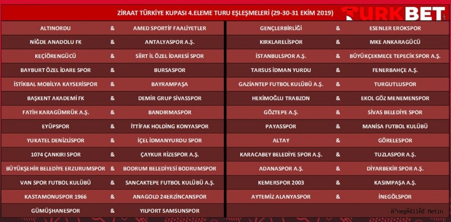 Ziraat Türkiye Kupası'nda 4. eleme turu maçları 29-30-31 Ekim 2019 tarihlerinde tek maç üzerinden oynanacak. Türkiye Kupası'nda 5. turdan itibaren çift maçlı eleminasyon sistemine geçilecek.