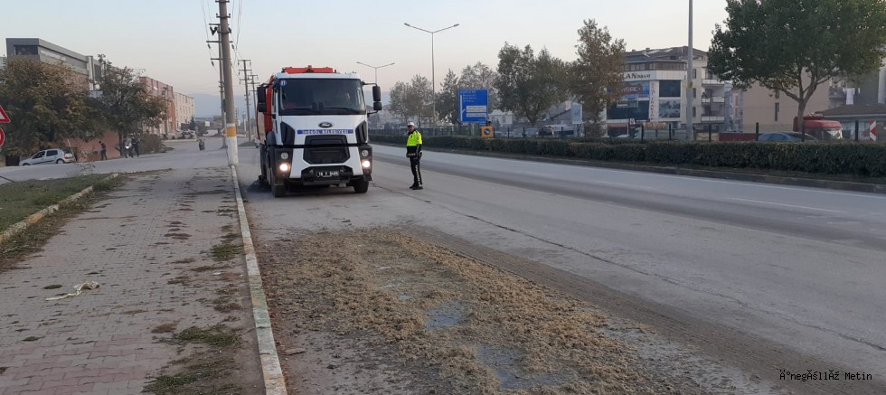 Olayın ardından kazaya neden olan sulu talaş, İnegöl Belediyesi’ne ait temizlik aracıyla temizlenerek yol tekrardan trafiğe açıldı.