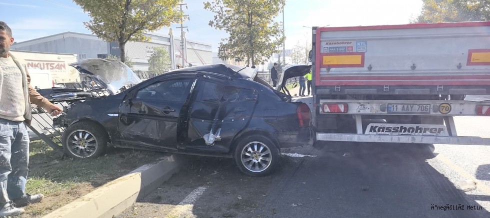 Edinilen bilgiye göre, kaza saat 11.30 sıralarında Bursa-Ankara karayolu üzeri İnegöl girişinde meydana geldi. İnegöl'den Bozüyük istikametine seyreden Suriye uyruklu Ammar A. Yönetimindeki 16 SCN 121 plakalı otomobil, iddiaya göre makas atarken refüjdeki ağaca, aydınlatma direğine ve koruma demirlerine çarptı. Savrulan otomobil, yolda seyir halinde olan Tahir A.(60) yönetimindeki 11 ABH 215 plakalı TIR'a arkadan çarptı. Kaza sonucu otomobilin sürücüsü ile araçtaki yolcu Sevil K.(34) yaralandı. Yaralılar kaza yerine sevk edilen Ambulansla İnegöl Devlet Hastanesine kaldırıldı. Otomobilin sürücüsüne ehliyetsiz araç kullanmaktan 18 bin 678 TL cezai işlem uygulandı. Polis kazayla ilgili soruşturma başlattı.