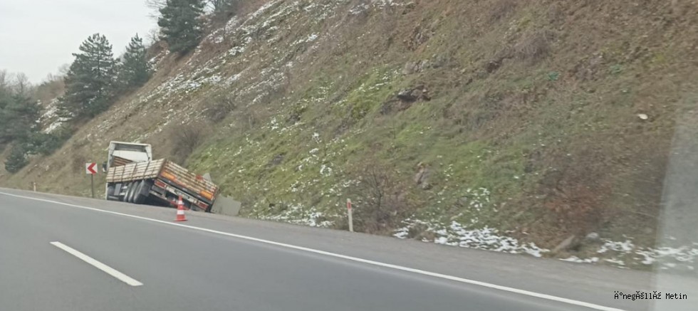 Seyir halindeki tır, iddiaya göre sürücüsünün direksiyon hakimiyetini kaybetmesinin ardından kontrolden çıkarak yol kenarındaki su kanalına düştü.