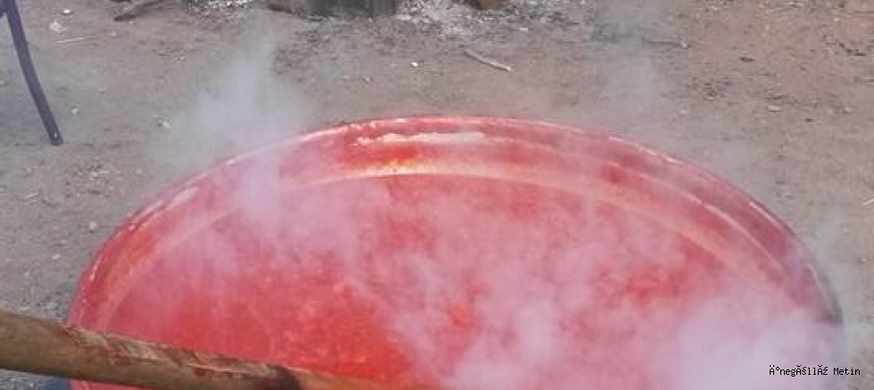 Daha sonra makineden geçirilen domates, kabuklarından ve çekirdeklerinden kurtulmuş bir vaziyette büyük ocaklar üzerine kurulmuş dev kazanlarda pişiriliyor.