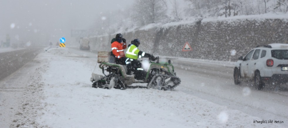 Daha sonra konuşan Tır Şoförü Kadri Atik ise, “Şuan için karayolları çalışıyor ama ilerleyen saatler için bir şey diyemiyorum. Biraz dikkatli, biraz yavaş olsun herkes. Acele etmeye gerek yok. Can güvenliği için yavaş. Bütün lastiklerimiz kar lastiği.Diğer sürücülerinde bunları tedarik etmelerini tavsiye ederim” diye konuştu.