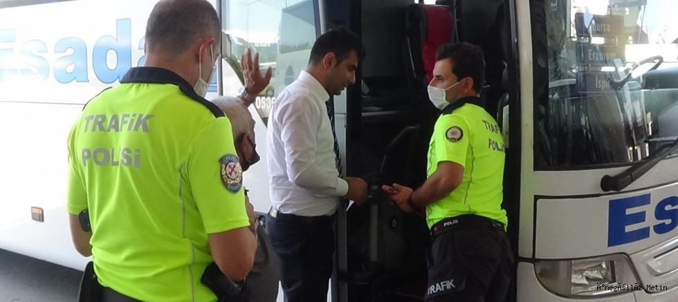 Trafik ekipleri, İnegöl Otogar girişinde ve çıkışında tek tek gelen otobüsleri durdurdu.