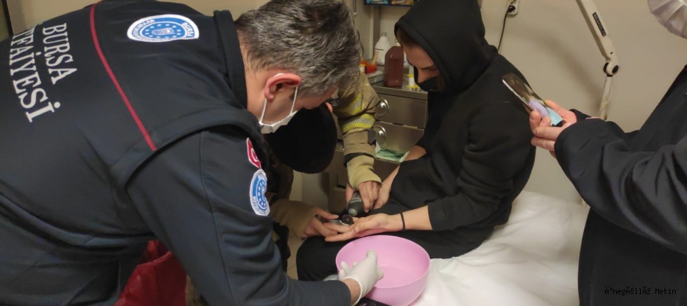 İnegöl itfaiye ekipleri İnegöl Devlet Hastanesi acil servis bölümü gelerek kısa sürede yüzüğü keserek parmaktan çıkardılar.yüzükten kurtulan genç kişi itfaiye ekiplerine teşekkür etti.