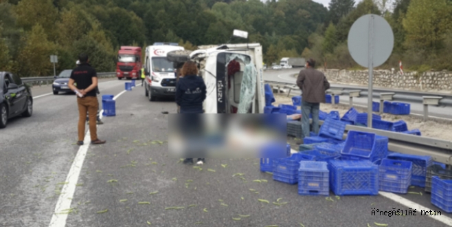Sebze yüklü kamyonun yan yatması sonucu sürücü Ömer Faruk Ç.(36) ile kardeşi Mehmet Akif Ç.(22) yaralanırken kamyonda bulunan sebzeler yol ortasına saçıldı. Yoldan geçen diğer sürücülerin kazayı 112 ekiplerine haber vermesi üzerine olay yerine gelen sağlık ekipleri yaralılara ilk müdahaleyi olay yerinde yaptıktan sonra İnegöl Devlet Hastanesine getirerek tedavi altına aldılar.