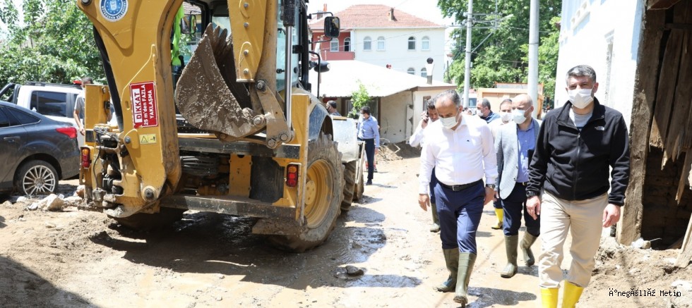 Bursa’nın Kestel ilçesinde önceki gün akşam saatlerinde meydana gelen 5 kişinin yaşamını yitirdiği, bir kişinin de kaybolduğu sel felaketinin ardından bölgede yaraların sarılması için başlatılan çalışmalar hızla sürüyor. Bölgede yaraların sarılması ve normal hayata biran önce dönülmesi için devletin tüm kurumları tarafından adeta seferberlik başlatıldı. Olayın ardından dün gece Bursa’ya gelen ve Bursa Valisi Yakup Canbolat ve Büyükşehir Belediye Başkanı Alinur Aktaş ile birlikte Dudaklı Köyü’nde incelemelerde bulunan İçişleri Bakanı Süleyman Soylu, bölgedeki incelemelerini bugün de sürdürdü. Soylu’ya, Tarım ve Orman Bakanı Bekir Pakdemirli de eşlik etti. Bu arada Bursa Büyükşehir Belediyesi ve BUSKİ ekiplerinin tam kadro olarak olayın yaşandığı ilk andan itibaren başlattığı çalışmalar kesintisiz devam ederken, devletin tüm kurumları tam bir seferberlik halinde, selden sarar gören mahallelerde vatandaşların yaralarını sarmaya çalışıyor.