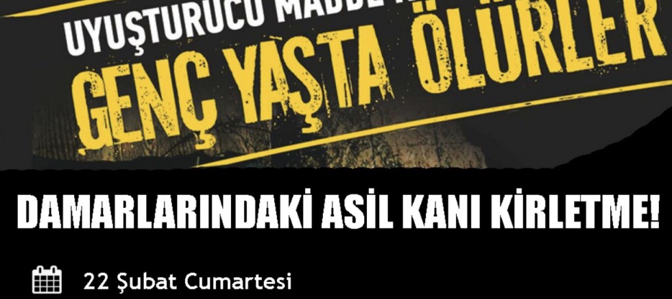 22 Şubat Cumartesi saat 20.00'da Sani Konukoğlu Konferans Salonunda düzenleyeceğimiz uyuşturucuya karşı mücadelemizde Ailelerin bilinçlendirilmesi adına 'Damarlarında ki Asil Kanı Kirletme' konulu seminerimize katılımlarınız Aileniz ve çocuklarınız adına önem arz etmektedir... Tüm halkımızı bu eğitim seminerine bekliyoruz.