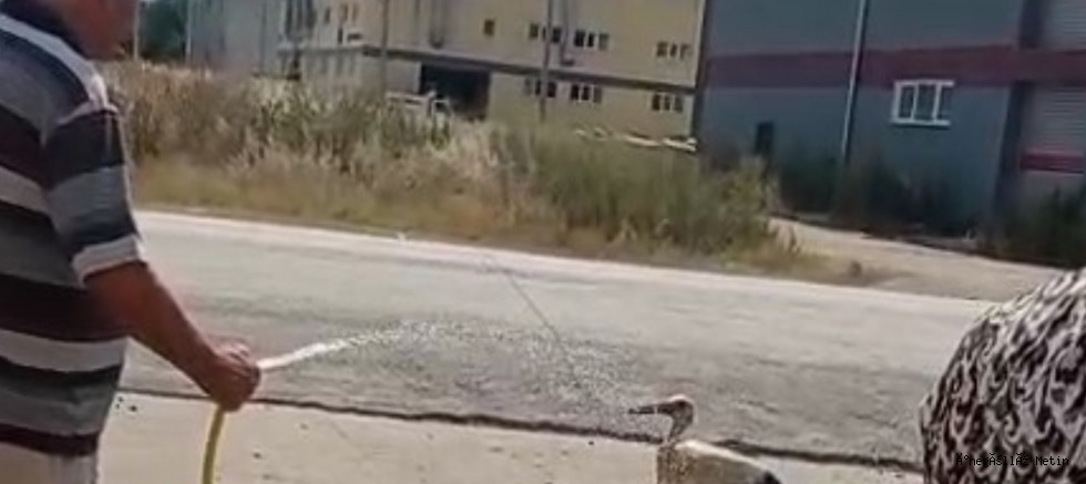 Hava sıcaklığının 40 dereceye yaklaştığı ilçede, susuzluktan ve sıcaktan bunalan bir leylek, Akhisar Mahallesi'nde evin önüne kondu. Gölgeye sığınan leyleği fark eden ev sahibi Hüseyin Kuzu, hortumla kuşu nazikçe ıslatarak ferahlamasını sağladı. O anlar cep telefonu kamerasıyla kaydedildi. Görüntülerde leyleğin, suyla temas ettikten sonra rahatladığı ve çevresine güvenle bakındığı görüldü.