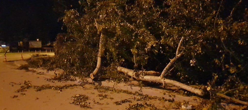 Burhaniye Mahallesi Hastane Caddesi üzerinde lodos gece saatlerinde etkisini arttırırken, bölgede bulunan tarihi ağaç yıkıldı.
