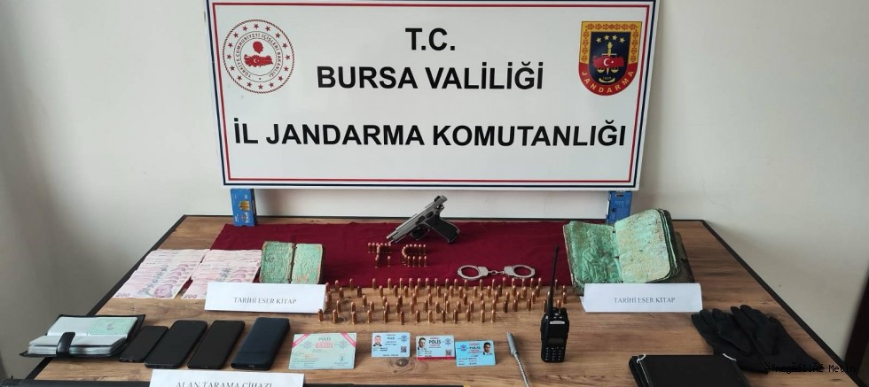 İnegöl İlçe Jandarma Komutanlığı ekipleri, şüpheli hareketler sergileyen bir aracı durdurdu. Araçta yapılan detaylı aramada; 2 adet tarihi eser niteliğinde kitap, 1 adet Sarsılmaz marka tabanca, 123 adet 45 kalibrelik tabanca mermisi, 1 adet kelepçe, 1 adet el telsizi, 1 adet tablet, 4 adet cep telefonu, 29 bin 800 lira nakit para, 4 adet “Polis” ibareli sahte basın kartı ile alan tarama ve yeraltı görüntüleme cihazları ele geçirildi.