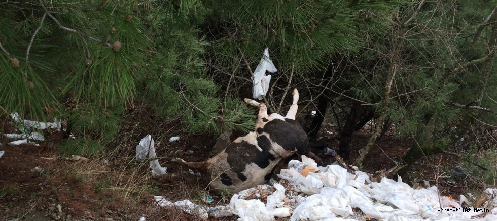 Ormanlık alanı çöplüğe çeviren çevre katilleri, bu sefer çöpün yanı sıra, telef olan bir hayvanı da çöplerle birlikte ormanlık alana attı.