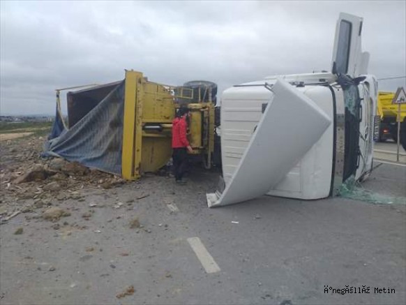 Çarpmanın etkisiyle kamyonun devrildiği kazada sürücü yaralanırken, molozlar da yola döküldü.