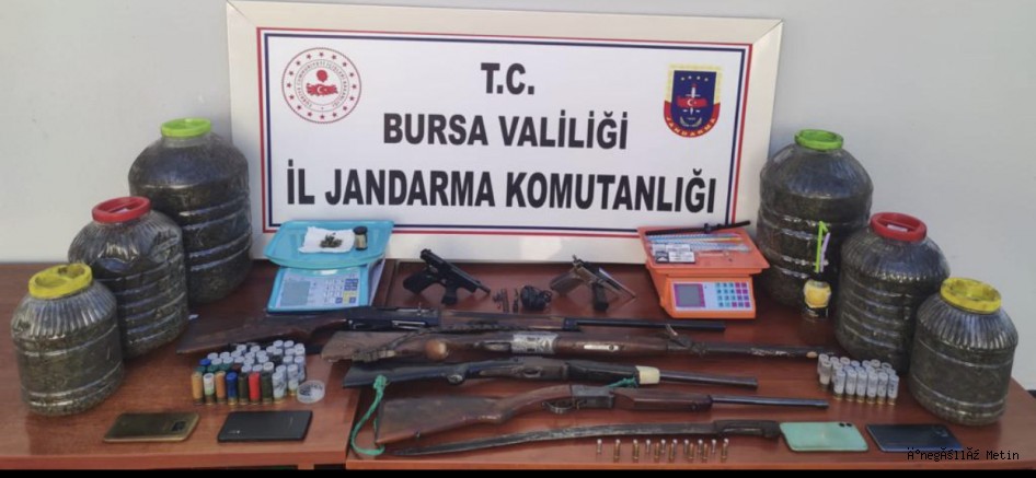 Operasyonda 9 kilo 10 gram esrar, 3 uyuşturucu kullanım aparatı, 2 hassas terazi, 7 madde kullanım pipeti, 2 tabanca, 2 şarjör, - 17 tabanca fişeği, 4 ruhsatsız av tüfeği, 59 tüfek kartuşu ele geçirildi.