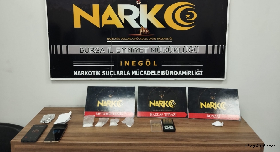 Bursa İl Emniyet Müdürlüğü Narkotik Şube Müdürlüğü İnegöl Büro Amirliği ekipleri uyuşturucu satıldığı bilgisine ulaştı. Ekipler 2 şüpheliyi takibe aldılar. Ekipleri gören şüpheliler kaçmaya başladı. Kovalamaca sonucu önü kesilen araç durduruldu. Araçta yapılan aramada 21 gram Metanfetamin ve 2 gram bonzai ile hassas terazi ele geçirildi. Şüpheliler A.D ve M.E., sorgulamanın ardından adliyeye sevk edildikleri mahkemece tutuklanarak cezaevine gönderildi.