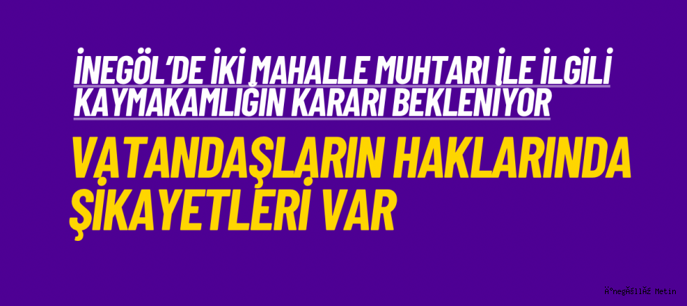 İnegöl Akhisar Mahalle Muhtarı Oktay Garip ve Ertuğrulgazi Mahallesi Muhtarı Ercan Uysal ile ilgili bazı iddialar nedeni ile İnegöl İlçe Kaymakamlığı’nın kararı bekleniyor. Garip, iddiaya göre oy kullanma kâğıdı almaya gelenlere seçimlerde CHP’ye oy kullanmaları için ikna etmeye çalışırken, Uysal ise seçim günü eline aldığı oy pusulası örneği ile vatandaşlara Kemal Kılıçdaroğlu’na oy vermeleri için telkinde bulundu.